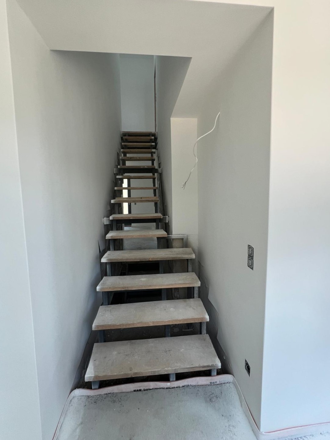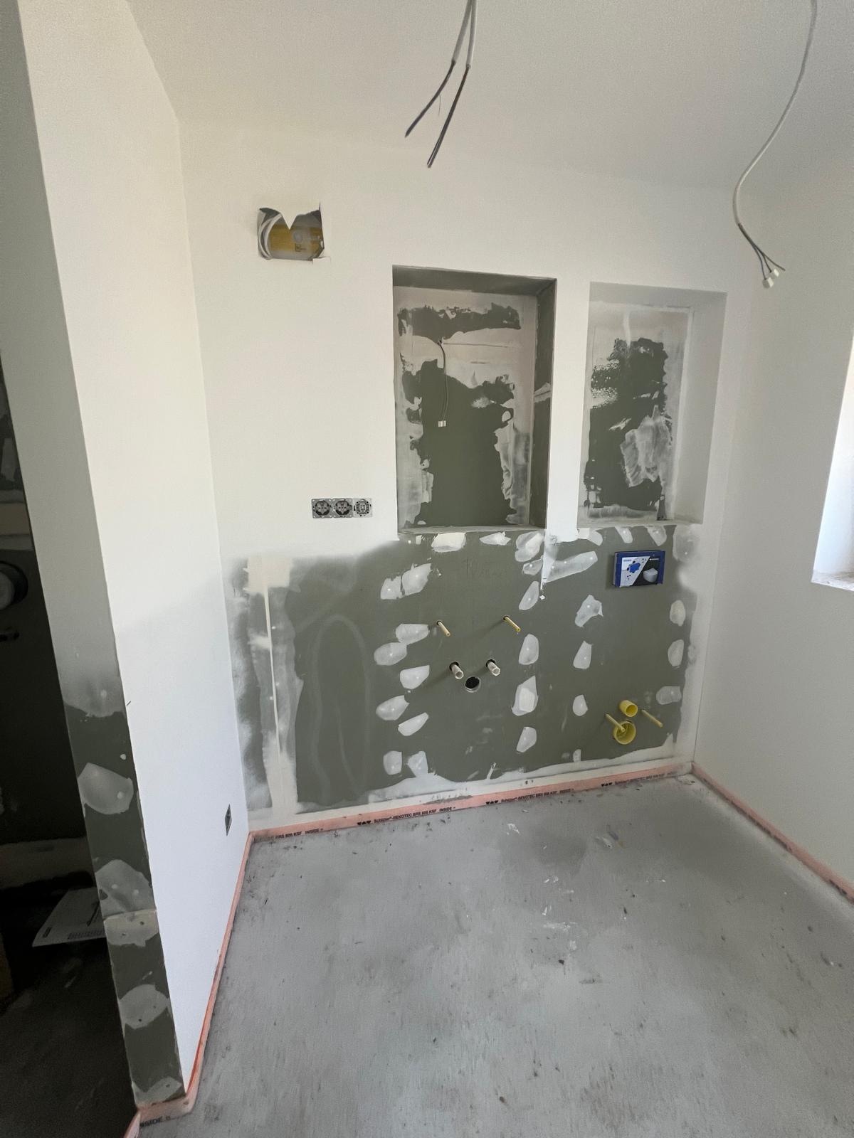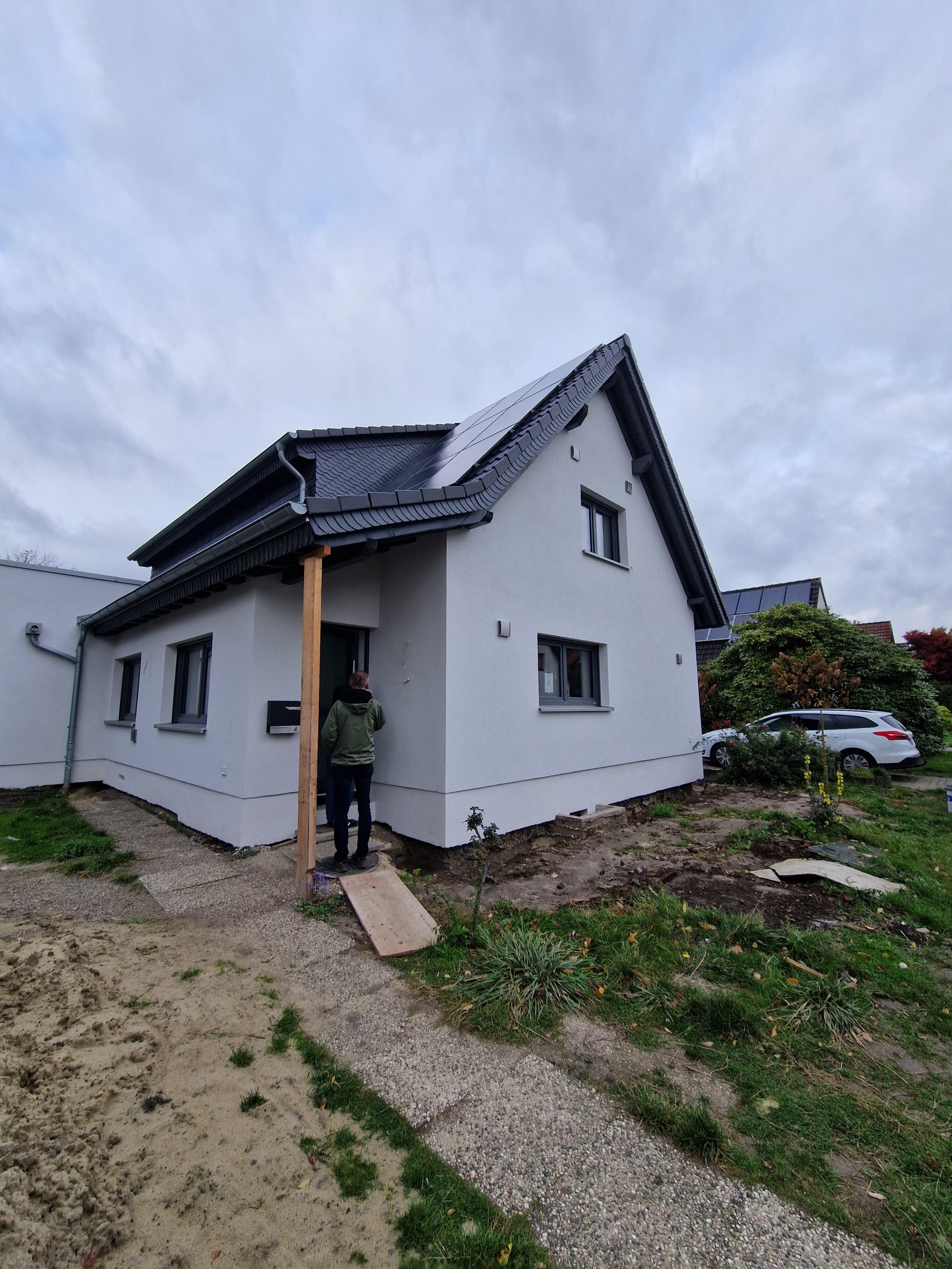 Für ein junges Ehepaar sanieren wir ein Einfamilienhaus und bauen es im Inneren massiv um. Die Planung sieht vor, mehr Platz im Dachgeschoss zu schaffen. Dazu brechen wir den Dachstuhl ab, betonieren 60 cm hohe Drempel und bauen einen neuen Dachstuhl mit einer großen Gaube. Das neue Dachgeschoss wird dann 2 Kinderzimmer, 1 Schlafzimmer und ein großes neues Familienbad enthalten. Die innere Anordnung der Räume im Erdgeschoss ist so konzipiert, dass das Haus bei Bedarf mit wenigen baulichen Veränderungen in ein Wohnhaus mit zwei Wohneinheiten umgewandelt werden kann. Dementsprechend ist auch die Elektrik vorbereitet und es gibt von Anfang an zwei Eingangstüren